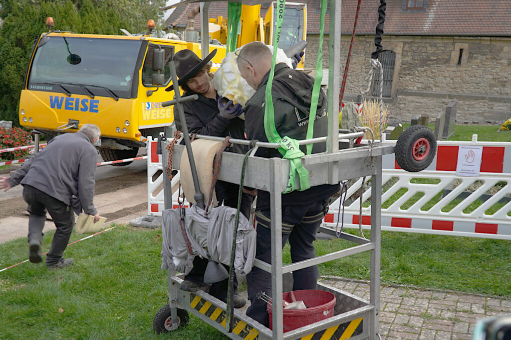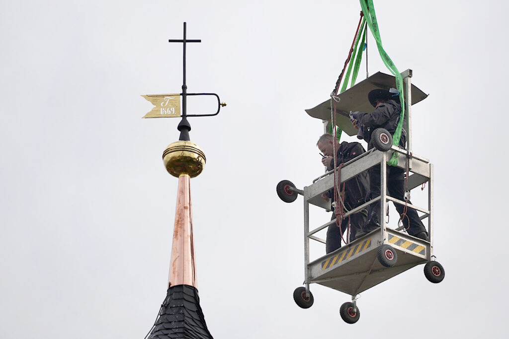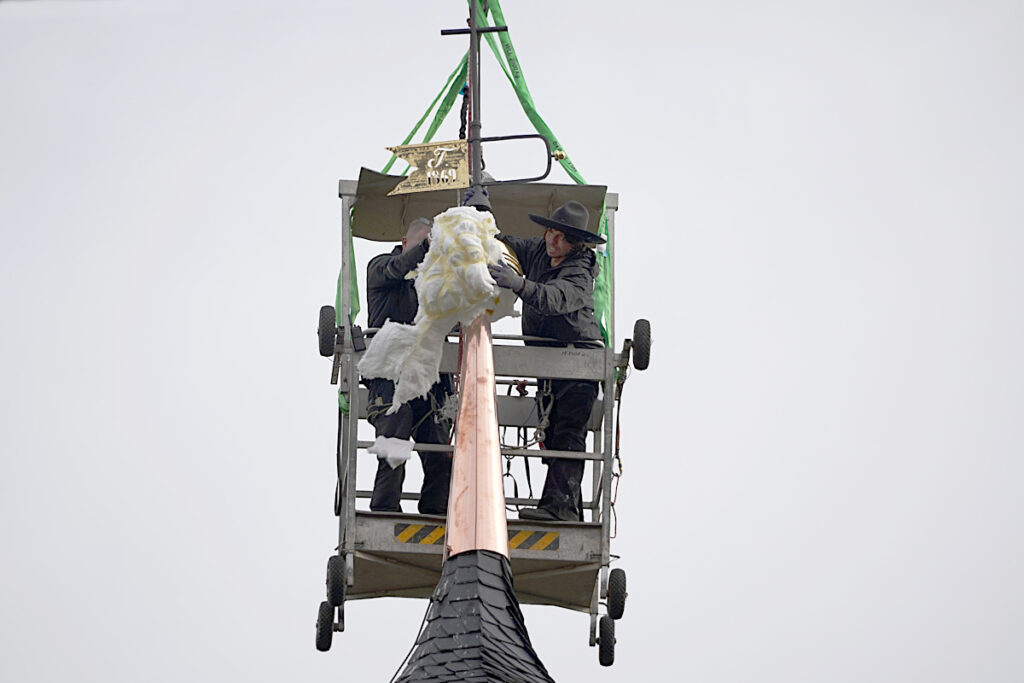 Nach dem Bltzschlag vom 28. Mai 2025 musst der Kirchturm der Kirche Peter und Paul saniert werden. Die Neubekrönung nach der Sanierung des Schieferdachs erfolgt am 14. Oktober 2025.