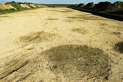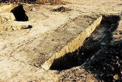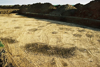 Auf diesem Bild sind die Stellen, wo Pfähle eingerammt waren deutlich zu erkennen. Sie markieren die Lage der Häuser. Im Vordergrund ist eine verfüllte Grube zu erkennen. Ihr wurde zunächst der Lehm für das Verschmieren der Wände entnommen. Später wurde sie mit Abfällen aufgefüllt.