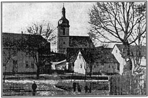 Umgeben von dem auf lieblicher Bergeshöhe gelegenen Friedhofe ist die Kirche mit ihren spitzbogigen Fenstern und Türen im spätgotischen Baustile errichtet. Nach einer an der Südwand des Schiffes befindlichen, nicht ganz verständlichen Inschrift, hat man den Bau 1510 begonnen. Doch ist das Gebäude nur an die Stelle eines früheren getreten, an welches 1418 der Turm angebaut wurde. Eine vermutlich später in diesen wieder eingemauerte Inschrift besagt: „Als Hans Weise und Thomas Rose Baumeister waren, da ward dieser Turm angebaut.“ Die vorgefundenen Aufzeichnungen im Turmknopfe berichten von einem Neubau des Turmes im Jahre 1595. Die italienische Haube, welche die Spitze des Turmes bildet, mag auch seit damals den Turm krönen und ihm von da ab ein gefälliges Aussehen verliehen haben. Gleichzeitig hallten die ersten Schläge der „Steigerglocke, die 1596 gehänget worden“, über das Dörflein hin. Die Jahre 1719 und 1920 ersetzten das jeweilige alte, ausgediente Uhrwerk durch ein neues wieder. 1751 und 1794 beschädigten Blitz und Wetterstrahl Turm und Kirchendach ganz erheblich. Wir treten in das Gotteshaus. Überrascht schauen unsere Blicke das schmucke Innere der Dorfkirche. Das festliches Kleid gab dem Hause im vergangenen Jahre nach eigenem Entwurf und eigener Ausführung „Meister Barthel“ aus Tiefthal. Die geschmackvolle Bemalung ist ein Zeichen dafür, daß auch heute noch „dörfliche Kunst“ zu finden ist. Der 1898 vorgenommene Umbau (Erneuerung des 1715 erbauten äußeren Treppenaufganges, neue Orgel, eine Empore) zeugt von dem opferfreudigen und christlichen Sinn der Dorfinsassen. Kanzel und Altaraufbau sind alt und im Barockstil gehalten. 1737 ließ sie Joh. Heinrich Hahn auf seine Kosten durch den Bildhauer Andreas Gessert aus Groß-Rettbach verfertigen. Die feierlichen Klänge des schönen Orgelwerkes rauschen durch den lichten Raum und brechen sich an den zart harmonisch-bundfarbig getönten Wänden und wecken an die heutige Wanderung denkend, einen Widerhall in unserer Brust, den der Mund im ewigwahren Liebe zum Ausdruck bringt: